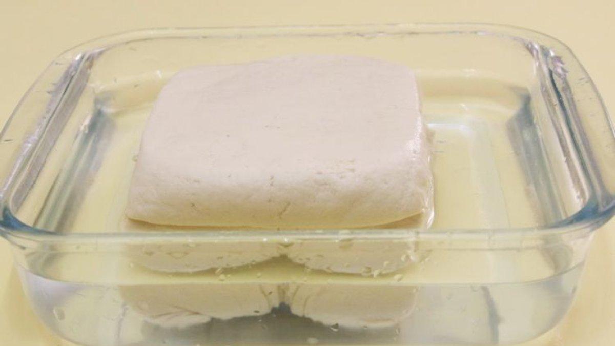 Jangan lupa buang air tahu yang ada dalam bungkusnya, lalu rendam tahu dengan air bersih.