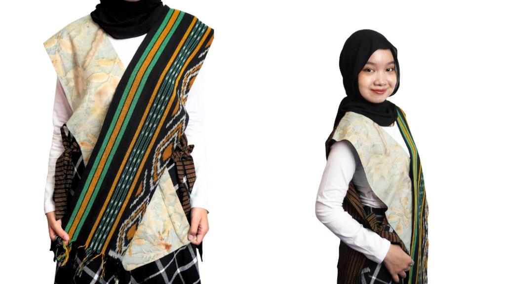 1. Outer Rompi Ecoprint Kombinasi Tenun Etnik dari Queen Craft