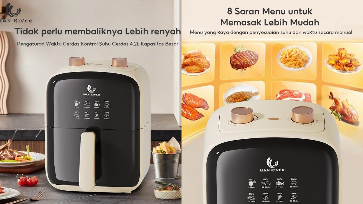 HAN RIVER Air Fryer 4.2L cocok untuk memasak menu lebih sehat bagi keluarga besar dengan 8 pengaturan alat yang memudahkan.