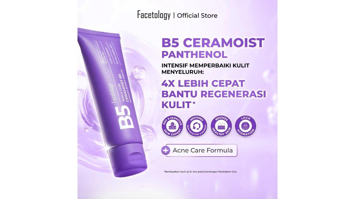 Facetology Triple Care Ceramoist B5 Barrier Boost Cream Diperkaya dengan Ceramide dan Panthenol untuk membantu mengunci hidrasi.